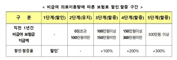 비급여 의료이용에 따른 보험료는 5단계로 차등화된다. 직전 1년간 비급여 보험금 지급액을 기준으로 1단계(없음)·2단계(100만원 미만)·3단계(100만원이상 150만원 미만)·4단계(150만원 이상 300만원 미만)·5단계(300만원 이상)로 나누고 1단계는 할인받고 2단계는 보험료를 유지할 수 있다. 3~5단계는 단계별로 100%씩 할증돼 5단계 사용자는 기준 보험료 대비 할증비율이 300%가 된다. 할증된 보험료는 보험금 할인을 받는 다른 소비자의 요금 할인을 보전하는 용도로 쓰이게 된다. 비급여 치료인 특약사항의 경우 자기부담률이 일괄 30%로 높아진다.