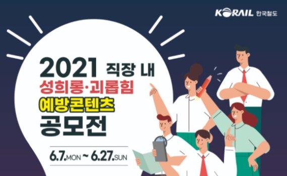 (대전=뉴스1) 김종서 기자 = 한국철도(코레일)가 내달 7일부터 27일까지 전 직원을 대상으로 ‘직장 내 성희롱과 괴롭힘 예방을 위한 콘텐츠 발굴’ 사내 공모전을 개최한다.