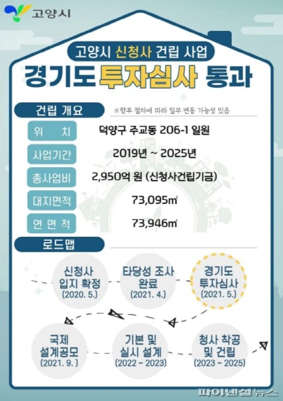 이와 함께 신청사 건물-부지 매입을 위한 ‘공유재산 관리계획’이 4월17일 고양시의회에서 통과돼 고양시는 관련 예산을 확보할 근거를 마련해 더욱 속도감 있게 건립사업을 추진할 수 있게 됐다. 총사업비 2950억원, 연면적 7만3946㎡ 규모의 신청사 건립은 오는 9월 국제 현상설계공모를 거쳐 내년 1월 건축 계획안이 최종 확정될 예정이다.