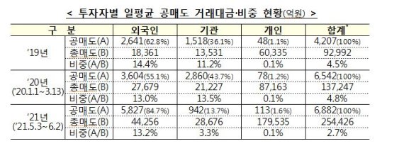 일평균 공매도 거래대금 6882억…공매도 비중은 약 40% 줄어