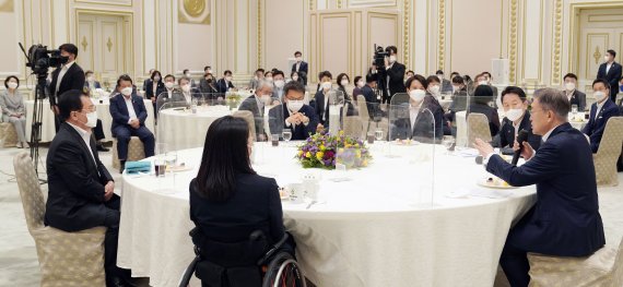 이날 문 대통령과 더민초는 청와대에서 약 1시간30분 가량의 간담회를 진행했다. 민주당 소속 초선의원 81명 중 68명이 참여했다. 지난해 4·15 총선 이후 문 대통령과 민주당 초선들이 단체로 간담회를 진행한 것은 처음이다.