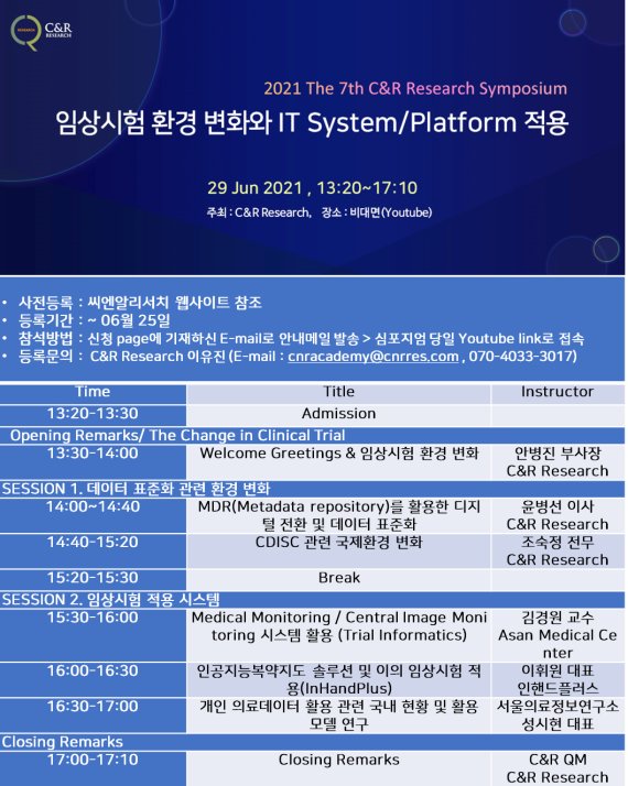 씨엔알리서치 윤문태 대표는 “코로나19로 높아진 신약 임상에 대한 관심 대비 여전히 부족한 관련 정보를 제공하고자 심포지엄을 기획했다”며 “안전하고 효과적인 임상에 대한 산업계의 요구가 최신 임상시험에 어떻게 반영됐는지 심포지엄을 통해 확인할 수 있을 것이다”고 말했다.