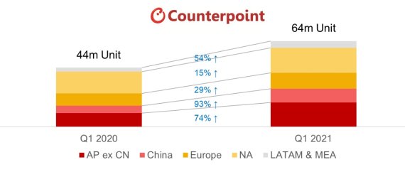 4일 글로벌 시장조사업체인 카운터포인트리서치에 따르면, 올해 1분기 글로벌 무선이어폰 판매량은 전년대비 44% 증가한 6400만대를 기록했다.