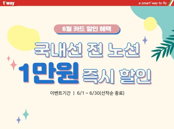 30일까지 티웨이항공 국내선 항공권 예약시 국민카드, 농협카드를 사용해 10만원 이상 결제하면 1만원 할인 혜택을 받을 수 있는 쿠폰을 제공한다. 쿠폰 사용이 가능한 기간은 8월 31일까지 항공편으로 일부 기간은 제외하며, 다운 받은 당일에 사용이 가능하다.