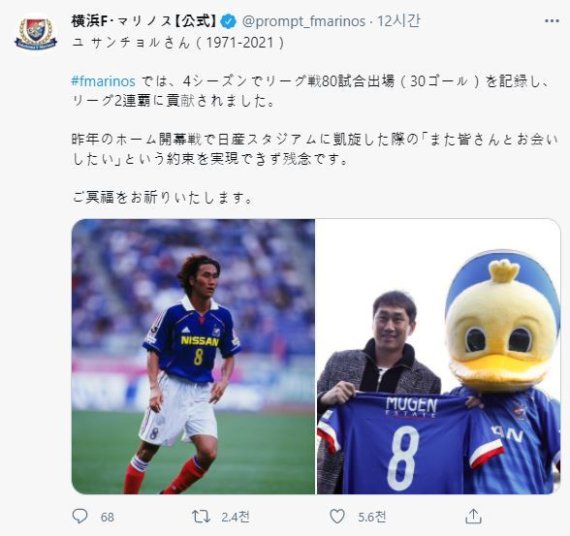 요코하마는 "유상철 감독은 4시즌 동안 80경기에 출전해 30골을 넣으며 리그 2연패에 공헌했다"며 "지난해 홈 개막전에서 '다시 여러분과 만나고 싶다' 했던 약속을 실현할 수 없게 돼 유감이다. 명복을 기원한다"고 추모 메시지를 전했다.