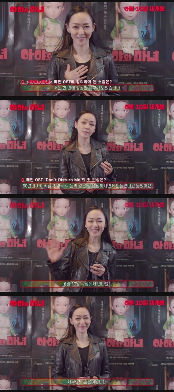 (서울=뉴스1) 정유진 기자 = 지브리 첫 3D FULL CG '아야와 마녀'(감독 미야자키 고로)가 주제곡 'Don’t Disturb Me'의 한국어 버전 가창과 개사는 물론, 빨간 머리 마녀 역 더빙까지 참여한 자우림 김윤아의 소감과 강력 추천 멘트가 담긴 스페셜 인터뷰 영상을 공개했다.