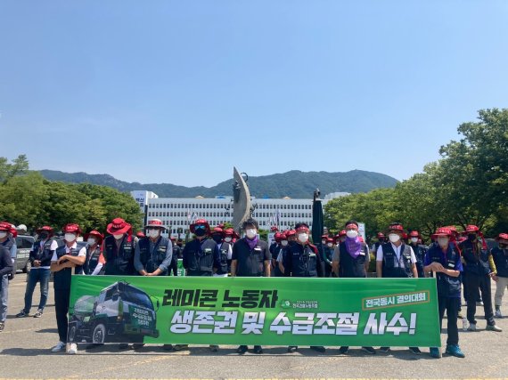 (경남=뉴스1) 김다솜 기자 = 민주노총 건설노조 경남지부는 9일 오전 경남도청 앞에서 레미콘 수급조절을 요구하는 결의대회를 열었다.