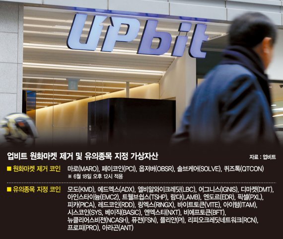 업비트는 오는 18일 오후 12시부터 마로(MARO), 페이코인(PCI), 옵저버(OBSR), 솔브케어(SOLVE), 퀴즈톡(QTCON)의 원화마켓 거래쌍(페어)를 제거한다고 13일 밝혔다.