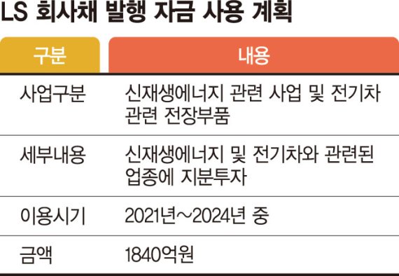 13일 관련업계에 따르면 LS는 지난 11일 회사채 발행을 통해 확보한 자금 1840억원 전액을 타법인증권 취득자금으로 사용할 예정이다. 다만 투자대상은 아직까지 명확히 확정되지 않아 부족할 경우 자체 자금으로 충당한다는 계획이다.
