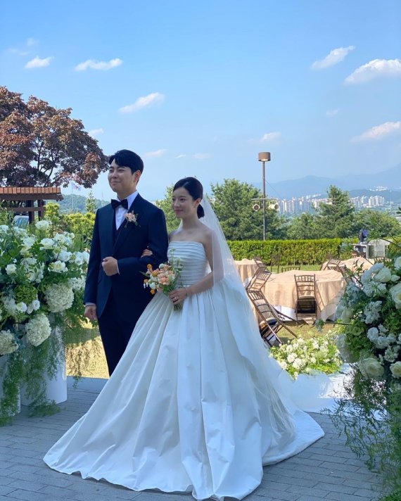 공개된 사진 속에는 벤이 순백의 웨딩드레스를 입고 남편인 이욱 이사장과 함께 팔짱을 끼고 결혼식을 진행하고 있는 모습이 담겼다. 두 사람은 환한 미소를 지으며 기쁨을 감추지 못하는 표정이다.