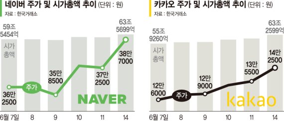그동안 3위였던 네이버는 같은 시간 전 거래일 대비 8500원(2.28%) 오른 38만1000원에 거래되면서 시총 62조5844억원을 기록, 간발의 차로 4위로 떨어졌다. 인터넷 기업 1위 업체였던 네이버가 한순간이지만 시총 3위자리를 카카오한테 내준 것이다.