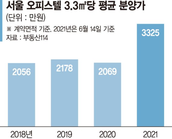 14일 부동산114에 따르면 올해 서울에서 분양한 오피스텔의 평균 분양가는 3.3㎡당 3325만원으로 지난해 2069만원보다 60.7% 높아진 것으로 나타났다.