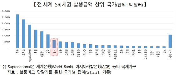 전 세계 SRI채권 발행국가 중에서 우리나라는 규모 면에서 미국과 프랑스, 초국가 국제기구, 독일, 네덜란드, 중국에 이어 7위로 성장했다.