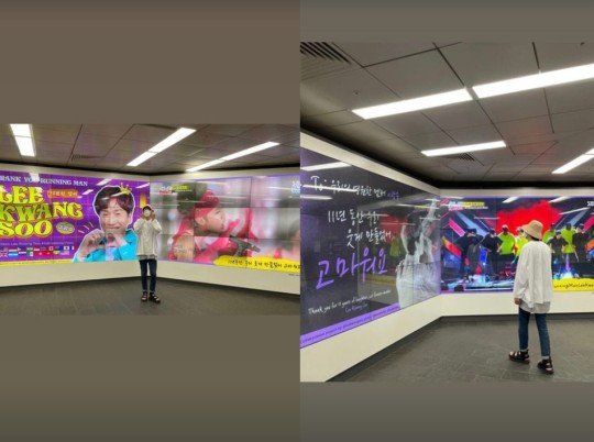 이광수는 15일 자신의 인스타그램 스토리에 근황이 담긴 사진을 올렸다. 공개된 사진 속에서 이광수는 팬들이 마련해준 지하철 전광판에서 인증 사진을 찍고 있는 모습이 담겼다.