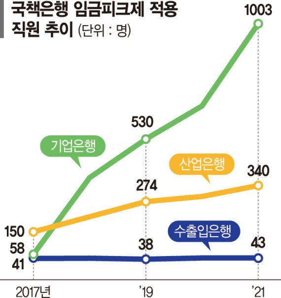 지난 2017~2021까지 5년간 임금피크제 인원을 파악해본 결과 산업은행은 2017년 150명 수준에 불과했으나 올 연말까지의 인원은 340명으로 2배 이상 늘어났다. 상대적으로 인원이 적은 수출입은행의 경우 매년 40명 안팎의 임금피크제 인원을 유지했다. 직원 1만3000여명을 거느린 기업은행은 임금피크제 적용 인원이 기하급수적으로 늘었다. 지난 2017년엔 58명에 불과했지만 이듬해엔 372명으로 4배 가까이 뛰었다. 올 연말까지 임금피크제를 적용받는 인원은 누적 1003명에 이를 것으로 집계됐다. 2020년(666명)에 비해 1년간 340여명이 늘었다.