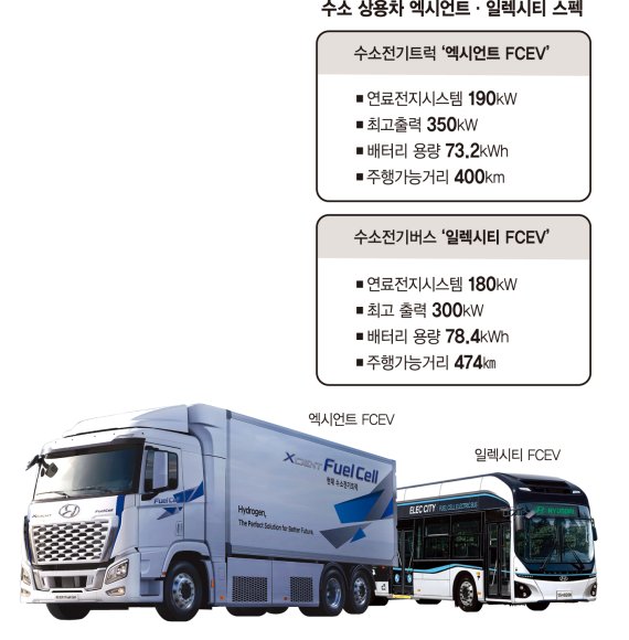 아울러 현대차가 개발한 수소전기버스 일렉시티 FCEV도 본격적으로 보급이 확대되고 있다. 2월 전국적으로 등록대수 100대를 돌파했고 지난달까지 106대를 기록중이다. 190㎾ 고용량 수소연료전지 시스템이 탑재돼 1회 충전으로 약 450㎞ 주행이 가능하다. 정부의 올해 보급목표는 현재 등록대수의 2배가 넘는 180대다. 환경부 관계자는 "수소전기버스 구입 시 국고보조금 1억5000만원을 지급한다"고 말했다.