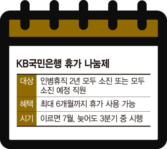 22일 금융권에 따르면 KB국민은행은 국내 시중은행 중 처음으로 휴가나눔제를 이르면 7월, 늦어도 3·4분기 중에 시행한다.