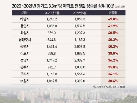23일 부동산 정보제공 업체 경제만랩이 KB부동산 리브온 주택가격동향을 살펴본 결과 경기도 3.3㎡당 아파트 전세가격이 1년새 크게 치솟은 것으로 확인됐다. 지난해 5월 경기도 3.3㎡당 아파트 평균 전세가격은 1019만6000원이었지만, 올해 5월에는 1328만4000원으로 1년 간 30.3%나 상승했다.
