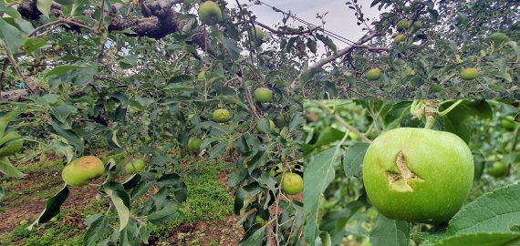우박을 맞은 사과, 배 등 과일은 곳곳이 파여 상품성이 떨어졌고 밭작물도 잎사귀가 상당부분 찢겨나가 수확량 감소가 예상된다.