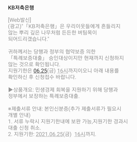 KB국민은행을 사칭한 문자는 '정부 보장 특례보증대출'이라는 점을 강조했다.