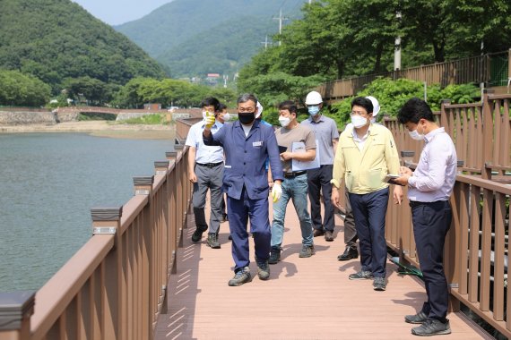 오 군수가 먼저 찾은 곳은 정관신도시의 배후 휴식공간으로 조성 중인 병산저수지 둘레길이다. 현재 군은 2017년부터 예산 59억원을 투입해 정관읍 병산저수지 둘레길을 조성하고 있다.