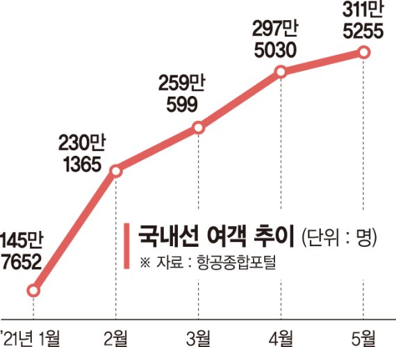 27일 항공업계에 따르면 지난 5월 국내선 여객수는 311만5255명으로 코로나 사태가 본격화된 전년 같은 달(188만7474명)보다 65% 급증했다. 월간 기준 국내 여객수가 300만명을 넘어선 것은 코로나 사태 이전인 지난 2019년 10월(303만454명) 이후 1년7개월 만에 처음이다. 올 들어 국내선 여객수는 1월 145만7652명에서 2월 230만1365명으로 늘어난 뒤 3월(259만599명), 4월(297만5030명)에 이어 지난달까지 증가세를 이어가고 있다.