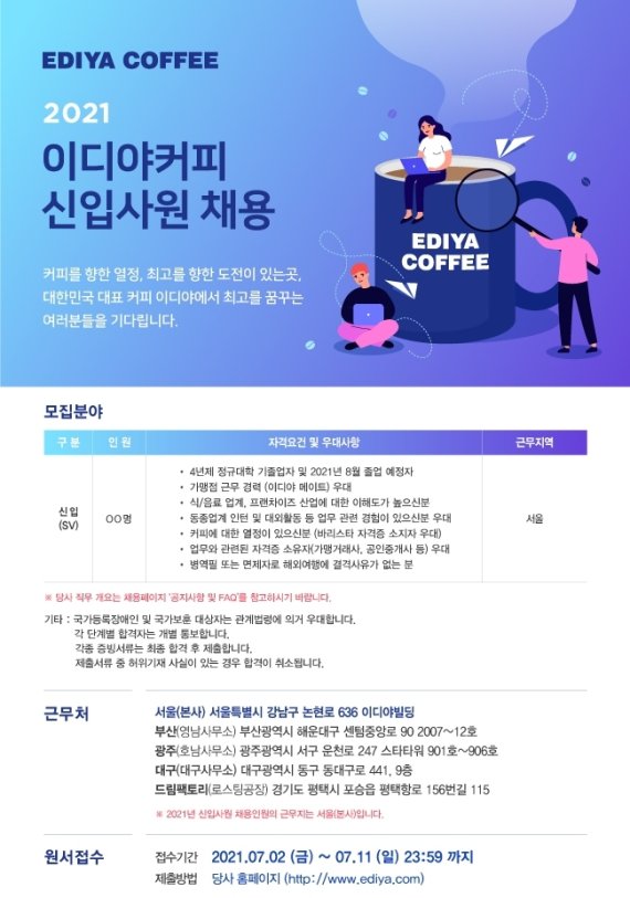 (서울=뉴스1) 황덕현 기자 = 이디야커피가 2021년도 하반기 신입사원 공개채용 접수한다고 28일 밝혔다. 채용분야는 운영(슈퍼바이저) 분야며 7월11일까지 서류를 접수한다.