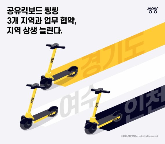 (서울=뉴스1) 이기범 기자 = 공유킥보드 서비스 '씽씽'이 여수시, 인천시, 경기도와 안전 업무 협약(MOU)을 체결했다고 28일 밝혔다. 씽씽은 지역 사회와 상생하는 공유킥보드 서비스를 제공하겠다는 방침이다.
