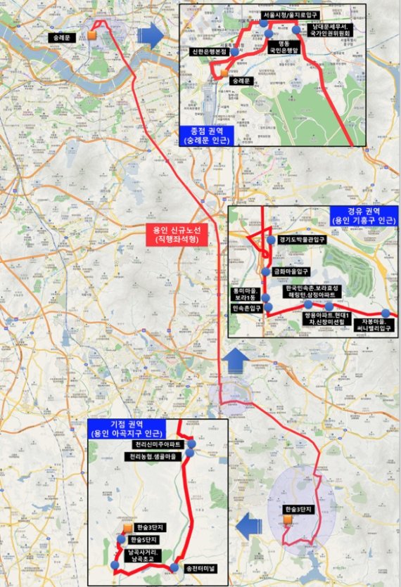 용인 지역은 남사아곡지구, 역북지구 등 개발사업에 따른 광역버스 이용 수요 증대에 대응하여 용인 남사아곡에서 서울역으로 운행하는 노선을 신설한다.