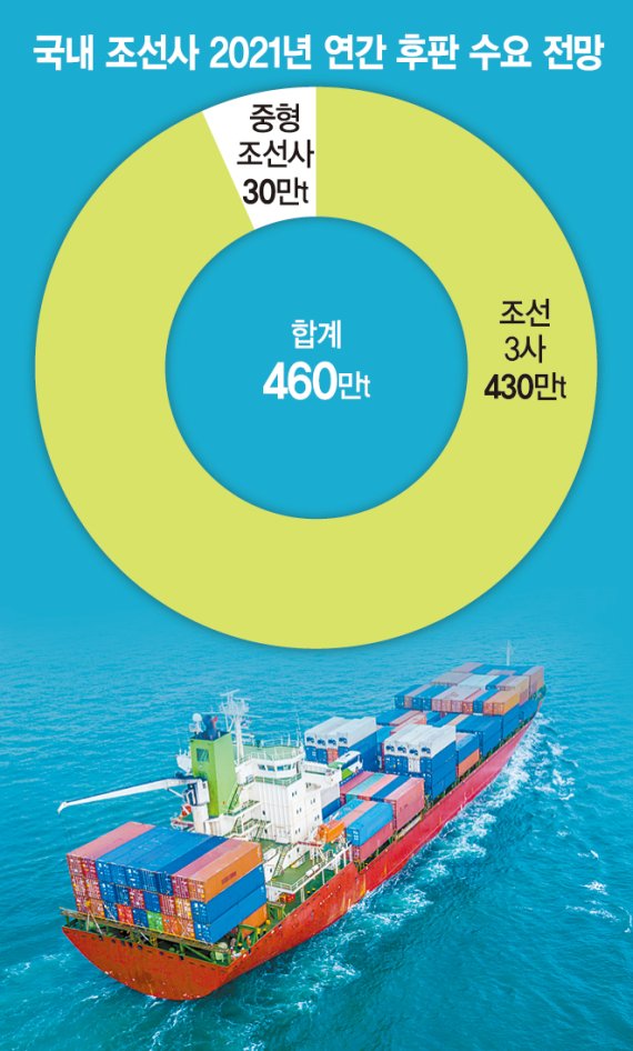 29일 관련 업계에 따르면 올해 국내 조선사의 후판 수요는 연간 460만t으로 지난해 421만t에 비해 39만t 늘어날 것으로 전망된다. 이 중 조선 '빅3'(한국조선해양, 대우조선해양, 삼성중공업)가 430만t, 중형 조선사 30만t 등이다. 특히 빅3의 경우 선박 수주량이 급격히 늘면서 하반기 후판 수요가 상반기 대비 약 70만t 가량 더 많은 것으로 나타났다.