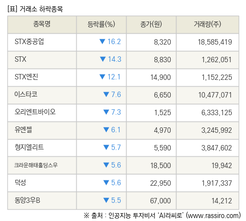 [fnRASSI]장마감, 거래소 하락 종목(STX중공업 -16.2% ↓)
