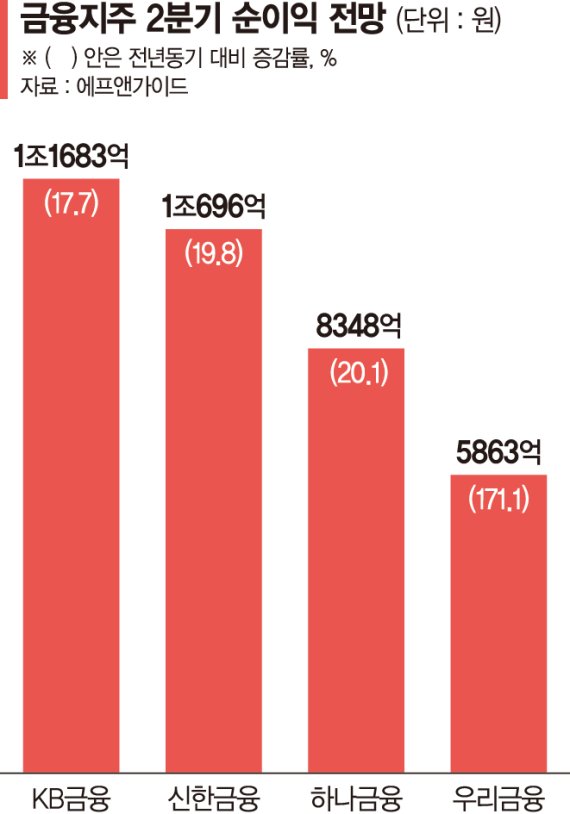1위는 KB금융이 수성할 것으로 예측됐다. KB금융은 2·4분기 순이익은 1조 1683억원으로 17.7% 증가할 것으로 전망됐다. 신한금융과 하나금융은 각각 1조 696억원, 8348억원으로 나왔다. 1년 전보다 각각 19.8%, 20.1% 성장한 수치다. 대출증가에 따른 이자이익 증가, 주식시장 호황에 따른 유가증권 관련 이익, 일회성 비용 감소 등이 호실적의 원인이다.
