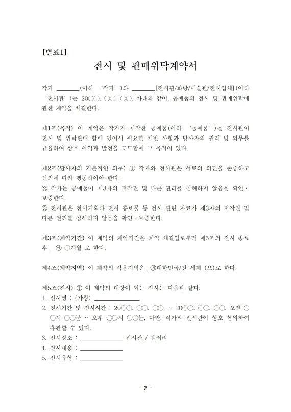 문화체육관광부(장관 황희, 이하 문체부)는 '공예 분야 표준계약서' 5종을 마련했다고 1일 밝혔다. 5종은 ① 전시 및 판매위탁 계약서 ② 판매위탁 계약서 ③ 판매 계약서 ④ 공예품 디자인 개발 용역 계약서 ⑤ 대관 계약서 등이다.