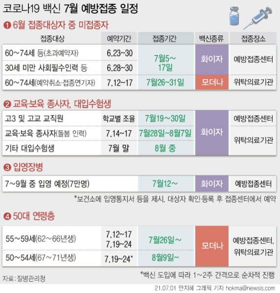 7월 예방접종은 6월까지 접종 대상자 중 미접종자를 최우선으로 해 60세 이상 고령층 등 상반기 1차 접종을 마무리하고 학교, 50대 일반 국민 순서로 진행된다.