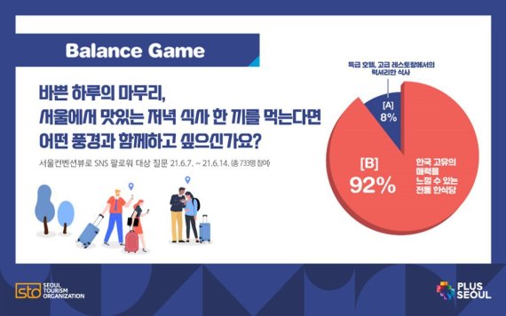 2일 서울관광재단이 사회관계망서비스(SNS)에서 포스트코로나 서울 비즈니스 여행 트렌드 조사를 위한 '밸런스게임' 형식의 댓글 이벤트를 전개한 결과 이같은 결과가 나왔다고 밝혔다.