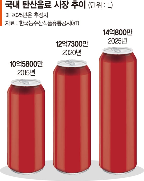 4일 한국농수산식품유통공사(aT) 식품산업통계정보에 따르면 국내 탄산음료 시장은 지난해 12억7300만L 규모로 전년 대비 4.7% 성장했다. 오는 2025년까지 연평균 2% 가량 성장하며 14억800만L에 이를 전망이다.
