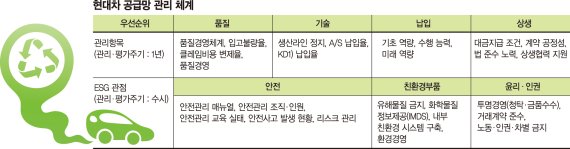 4일 현대차에 따르면 공급망 관리 정책의 일환으로 올해부터 ESG 관점에서 수시로 협력사 평가를 진행한다. 안전 분야에선 안전관리 매뉴얼, 안전관리 조직·인원, 안전관리 교육 실태, 안전사고 발생 현황, 리스크 관리를 평가한다. 친환경 부품 분야에선 유해물질 금지, 화학물질 정보제공(IMDS), 내부 친환경시스템 구축, 환경경영 등을 점검하고 인권분야에선 투명경영(청탁·금품수수), 거래계약 준수, 노동·인권·차별 금지를 중점적으로 본다.