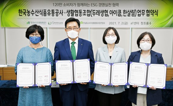 4개 기관은 지난 2일 서울 aT센터에서 업무협약을 체결하고, 안전한 친환경농산물 공급, 자원 재활용 및 탄소 절감, 친환경 사회적 가치 공유 등을 위한 다양한 협력에 나서기로 했다. 우선 ESG 경영실천을 위해 공사는 친환경 포장재를 위한 협력 재원을 지원하고, 두레생협에 비닐포장 대신 종이포장재 사용, 아이쿱에는 친환경종이팩 생수 보급, 한살림에는 재활용 보냉백 제작 등 기관별로 특성에 맞게 협력사업을 추진할 계획이다.