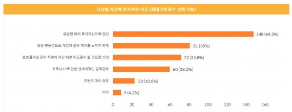 보고서에 따르면 투자자들은 디지털 자산을 유망한 미래 투자자산으로 인식해 투자하는 경향이 69.5%로 가장 높았다. 그 뒤를 이어 '높은 변동성으로 게임 같은 재미를 느끼기 위해' '포트폴리오 관리에 도움이 되기 때문'이라는 응답이 각각 38%, 33%를 차지했다.
