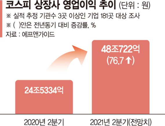 5일 금융정보업체 에프앤가이드에 따르면 증권사 3곳 이상의 실적 전망치가 있는 181개 상장사의 2·4분기 영업이익 합계는 48조722억원으로 지난해 2·4분기(24조5334억원) 대비 76.7% 증가한 것으로 추정됐다. 이는 역대급 실적으로 평가받는 지난 1·4분기(43조403억원)보다도 11.7% 높은 수치다.