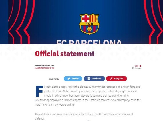 바르셀로나 구단은 8일(한국시간) 홈페이지를 통해 "1군에 있는 두 선수가 호텔 직원을 존중하지 않는 모습을 보였다. 일본과 아시아 팬들이 불쾌감을 느끼게 한 것에 대해 깊이 반성한다"고 전했다.