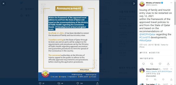 카타르 내무부는 8일(현지시간) 트위터를 통해 "가족 및 관광객 입국 비자 발급이 2021년 7월 12일부터 재개된다"고 밝혔다.