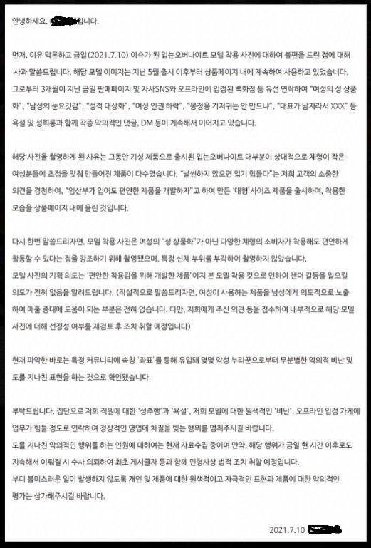 이어 "해당 모델 이미지는 지난 5월 출시 이후부터 상품페이지 내에 계속해 사용하고 있었다"며 "3개월이 지난 금일 판매페이지 및 자사 SNS(사회관계망서비스)와 오프라인에 입점된 백화점 등에 연락해 각종 악의적 댓글 등이 계속해 이어지고 있다"고 설명했다.