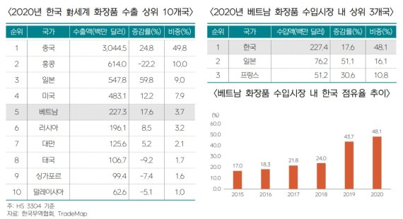 김보경 무역협회 수석연구원은 "올해부터 한-베트남 자유무역협정(FTA)에 따라 한국 화장품에 대한 관세인하 혜택이 커지는 만큼 우리 기업들에 더 큰 기회가 열릴 것"이라며 "수출 동력을 지속적으로 창출하기 위해서는 디지털 플랫폼상의 고객들과의 접점 확대, 매력적인 콘텐츠 제공 등 긴 호흡으로 부가가치를 확대하는 전략이 중요하다"고 말했다.