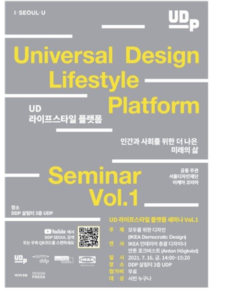 전시와 연계한 UD 라이프스타일 플랫폼의 첫 번째 세미나도 오는 16일 열린다. 시민 누구나 시청할 수 있도록 DDP홈페이지와 유튜브에서 온라인으로 생중계된다.