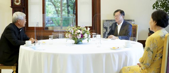 [파이낸셜뉴스] 문재인 대통령 내외는 12일 교황청 성직자성 장관으로 임명된 유흥식 대주교의 예방을 받고 접견했다.