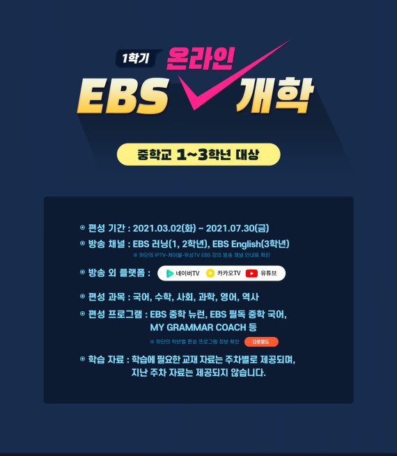 앞서 EBS는 코로나 사태로 전면 원격 수업이 시작된 지난해 4월부터 초등학교 1학년에서 중학교 3학년까지 9개 학년 대상 'EBS 온라인 개학'을 긴급 편성해 방송 중이다. 지난 3월부터는 2021학년도 1학기 프로그램을 방송하고 있으며, 다음 달부터는 여름방학 프로그램을, 9월부터는 2학기 프로그램을 방송할 예정이다.