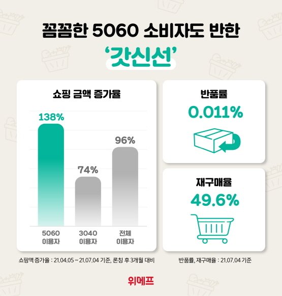 15일 위메프에 따르면 최근 지난 4월 이후 3개월 동안 갓신선 5060 이용자 쇼핑 금액은 서비스 시작 초기와 비교해 2.4배(138%) 늘었다.