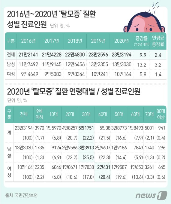 2016년부터 2020년가지 5년간 '탈모증' 질환으로 한번 이상 진료를 받은 인원은 87만6000명으로 나타났다. 인구 10만명당 기준으로 보면 탈모증 질환 진료인원은 2016년 418명에서 8.6% 증가해 2020년에는 454명을 기록했다.