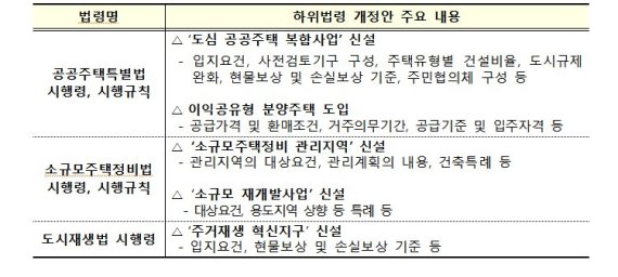 이와 함께 국토부는 2·4 대책에서 제시됐던 소규모주택정비사업과 소규모 재개발사업, 주거재생 혁신지구 사업 등의 구체적인 내용을 정하는 '빈집 및 소규모주택 정비에 관한 특례법'과 '도시재생 활성화 및 지원에 관한 특별법'의 시행령 등 하위법령 개정안도 이날 입법 예고했다.